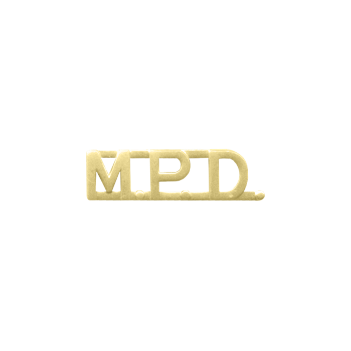 Enhance your uniform with this impressive handcrafted "M.P.D." letter combination. The letter style shown is used to spell out the word.