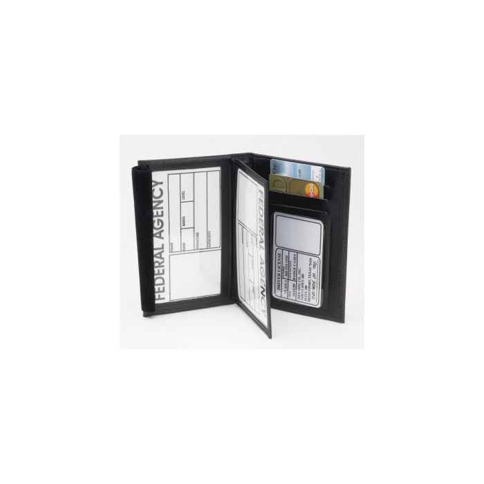 Deluxe Double ID Case with CC Slots. Providing multiple features, this wallet design specializes in spacious functionality. Features 3 credit card slots plus 2 clear vinyl pockets for the IDs. Holds two IDs up to 3” x 5”. Clear anti-scratch vinyl windows protect IDs. Case does not hold a badge. Available in Black Plain and Basket Weave Leather.