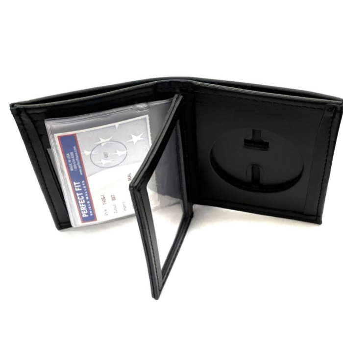 Unique badge wallet case designed with a center double-sided, license size, ID window. Corners are turned and stitched for a high-quality finish. The left side of the wallet can hold up to two credit cards. The badge is recessed inside on the right side. Compatible with most standard badges up to 2 1/2" in width. 2 credit card slots, 1 slot is clear vinyl, plus a double sided vinyl ID pocket. Money pocket holds bills securely. Available in Black or Brown, Plain or Basketweave leather.